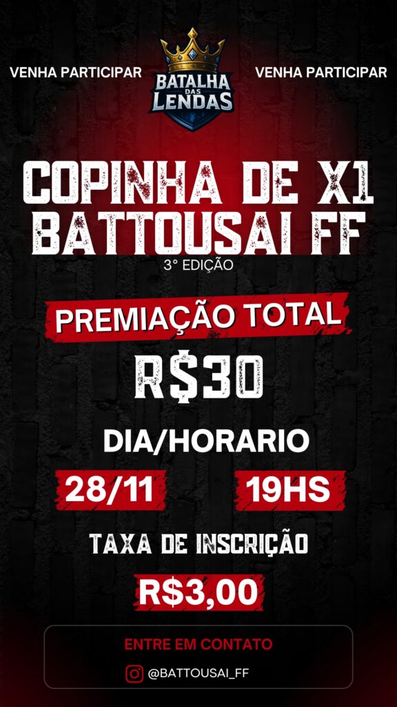 Prepare-se para a batalha, tropa! A 3° Edição da Copinha de X1 Battousai FF está chegando — e promete ser o torneio mais insano do ano. Um campeonato X1 no estilo apostado, com regras equilibradas, muita estratégia e apenas os verdadeiros guerreiros do Free Fire chegando à final. ⚔️