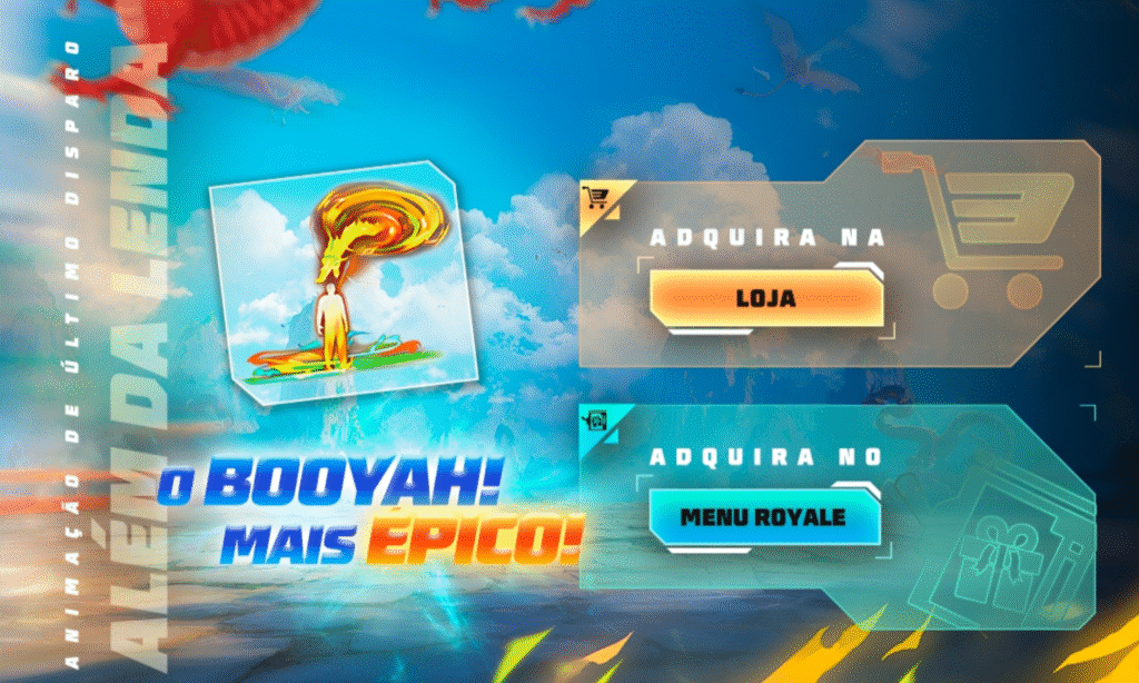 Para encontrar a skin, basta abrir o Free Fire, acessar a aba “Loja”, selecionar a categoria “Destaque” e, em seguida, tocar em “Além da Lenda”. Lá, você poderá visualizar o efeito especial “Disparo Final”, que deixa o visual do Booyah ainda mais marcante no final das partidas.